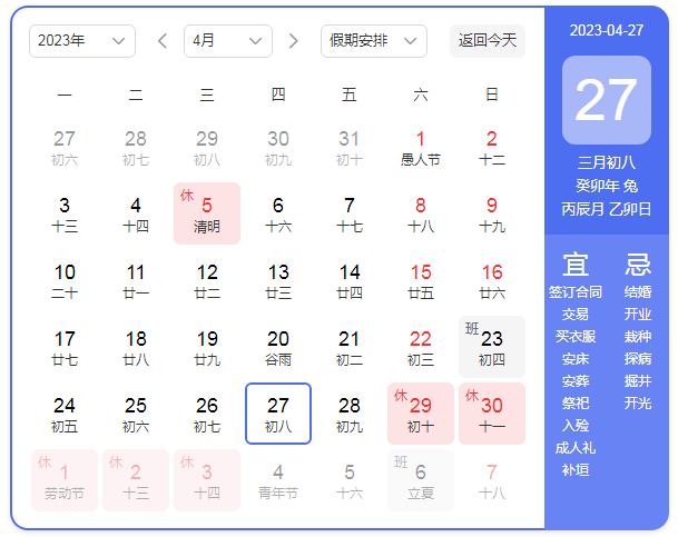 4月29日(星期六)至5月3日(星期三)放假調(diào)休,共5天。4月23日(星期日)、5月6日(星期六)上班。